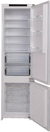Вместительный 310-литровый холодильник в белом корпусе. Комбинированная система охлаждения: NoFrost в морозильной камере и капельная в холодильной. Ударопрочные стеклянные полки и возможность перенавешивания двери. Энергоэффективное светодиодное освещение.