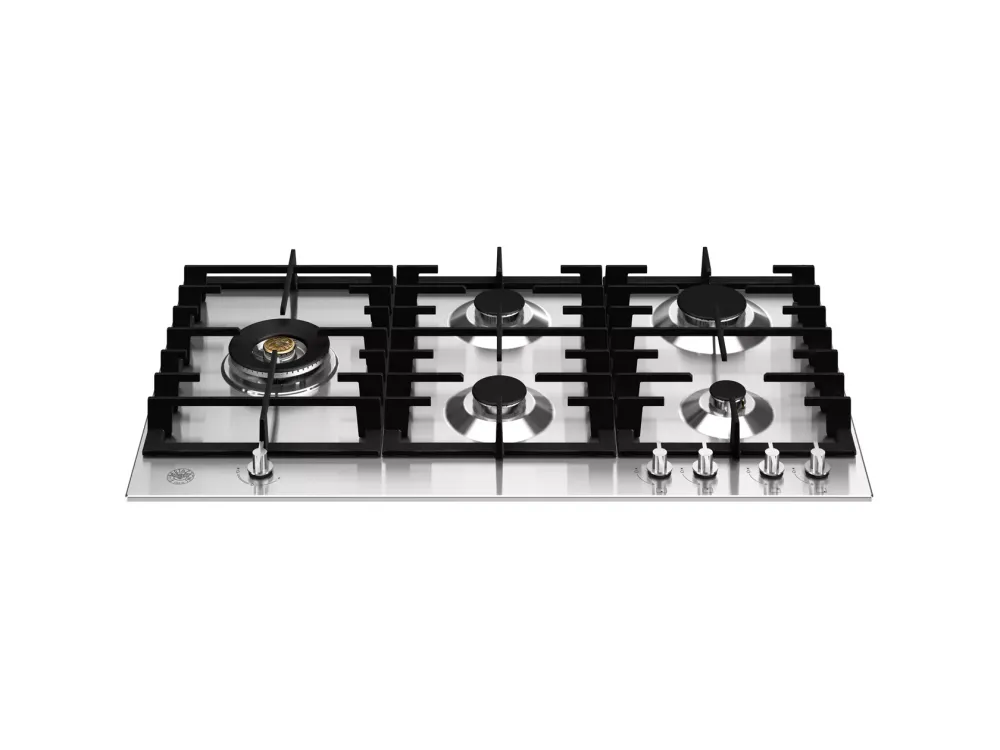Газовая варочная поверхность Bertazzoni серии Modern шириной 90 см оснащена пятью алюминиевыми конфорками и эргономичными металлическими рукоятками управления, что делает приготовление пищи простым и точным. Боковая конфорка dual wok с тройными рядом пламени мощностью 5 кВт обеспечивает дополнительную универсальность. Чугунная решётка прочная и безопасная.