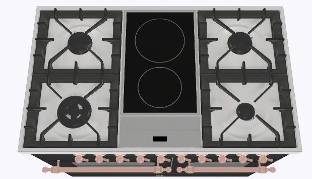 2 индукционные, 4 газовые, 1 Dual конфорка