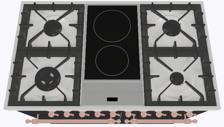 2 индукционные, 4 газовые, 1 Dual конфорка